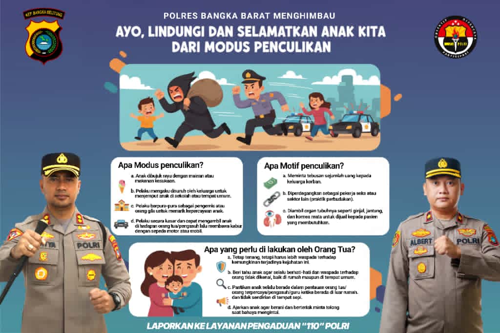 “Melalui kami, Kapolres Bangka Barat menghimbau seluruh orang tua untuk melindungi dan menyelamatkan anak-anak dari modus penculikan. Pastikan mereka selalu berada dalam pengawasan dan jangan mudah mempercayakan anak kepada orang yang tidak dikenal,” ujarnya.