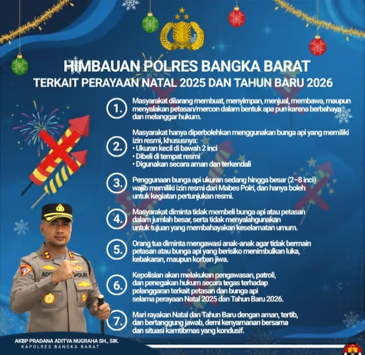 Kepolisian Resor (Polres) Bangka Barat mengimbau masyarakat untuk tidak menggunakan petasan maupun kembang api secara sembarangan menjelang perayaan Natal 2025 dan Tahun Baru 2026, guna menjaga keamanan dan ketertiban masyarakat (kamtibmas).Rabu 24 Desember 2025