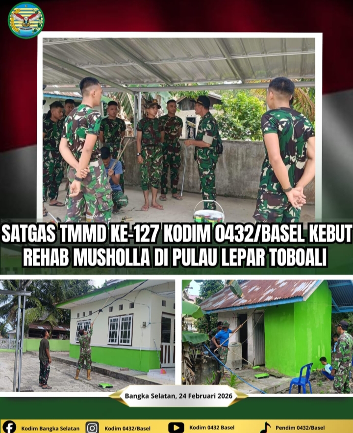 *Pulau Lepar Toboali, 24 Februari 2026* – Dalam rangka Bulan Suci Ramadhan dan sarana ibadah serta meningkatkan semangat gotong royong, Satgas TNI Manunggal Membangun Desa (TMMD) ke- 127 TA 2026 Kodim 0432/Basel *Kebut mempercepat perbaikan (rehab) Mushola Al Munawar yang berlokasi di Desa Penutuk Pulau Lepar Kab Basel.*